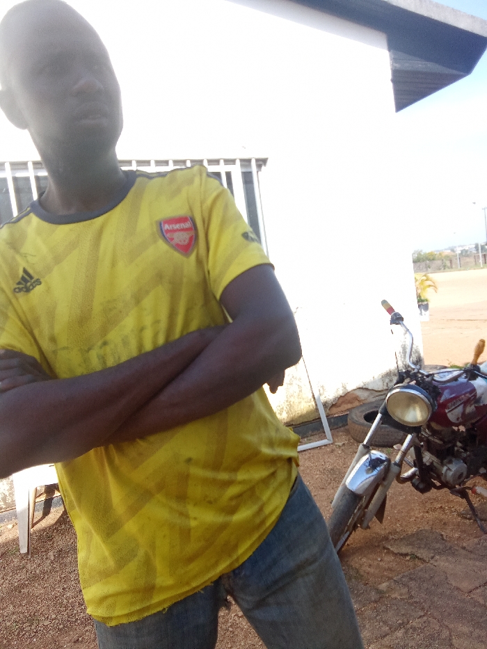 In Bar Jirgi Summa, Nigeria, an unpaved reddish-brown ground surface forms the foreground. A dark-skinned male, with a bald head and wearing a soiled yellow Adidas "Arsenal" football jersey and blue jeans, stands with his arms crossed, looking directly at the viewer. Behind him to the right, a red/maroon motorcycle with a circular headlight is parked, leaning on a kickstand. Behind the motorcycle, against a white wall showing some discoloration, two dark tires and a white rectangular frame are present. A white plastic chair is partially visible behind the male's left leg. The white wall features vertical barred windows to the left. An architectural overhang extends from the top right. The background reveals an open, unpaved area with distant vegetation and structures under a bright sky.