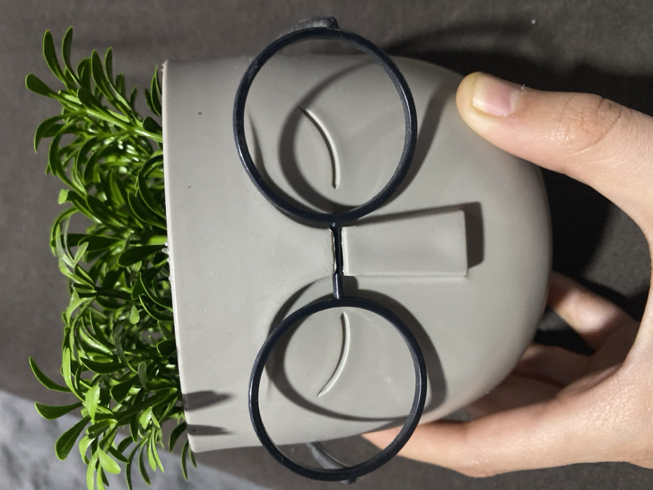 - "In Kozloduy, Bulgaria, a light-skinned human hand grasps a light gray planter shaped like a minimalist human face" by FM-L4KtV2, licensed under CC BY 4.0