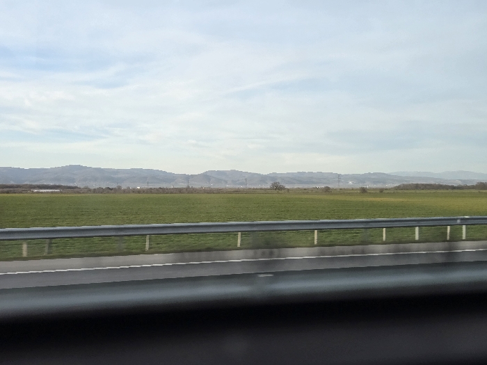 The scene is an exterior daytime landscape captured from a moving vehicle, depicting a rural highway environment near Sarnevo, Bulgaria. The foreground features a dark, blurry horizontal element, likely a vehicle interior component, positioned beneath an asphalt roadway. The multi-lane road includes a white solid line on its right edge and a broken white lane marker. A silver-colored metal guardrail, consisting of horizontal rails supported by vertical posts, runs parallel to the road, separating it from a large, flat, vibrant green agricultural field. Scattered within this field are several bare deciduous trees. The background consists of a chain of distant, grayish-blue hills or mountains on the horizon, beneath a sky with pale blue patches and wispy white clouds. On the far left, indistinct white structures are visible beyond the field, and a tall, slender pylon or mast is faintly discernible against the distant hills on the right. No individuals or specific actions are observed.
