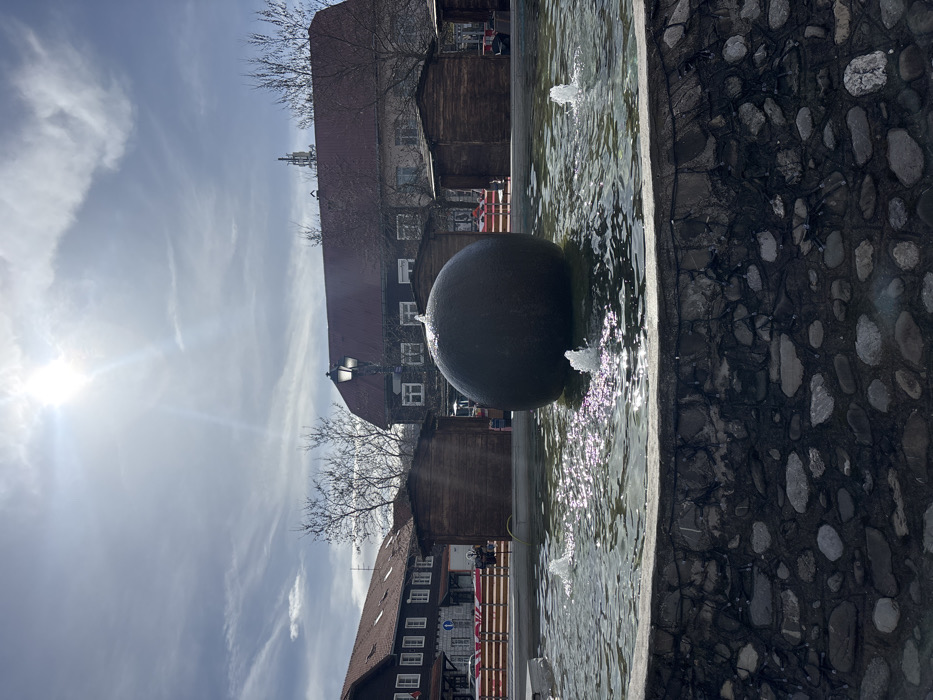 The image captures a public square in Kolašin, Montenegro, observed from a low perspective. A circular fountain with a stone-and-cobblestone base dominates the foreground. Within the fountain basin, water is agitated, and a large, dark, spherical object is centrally positioned, with water cascading over its upper surface. Three smaller water jets are active, spraying water upwards from the basin. The water's surface reflects strong sunlight. Behind the fountain, several small, dark-stained wooden hut-like structures with pitched roofs are arranged. To the left, a multi-story building with dark siding, numerous white-framed windows, and a red-brown pitched roof is visible. To the right, another larger, darker building with a prominent red-brown pitched roof and visible white-framed windows stands. A dark-colored street lamp with a globe-shaped light fixture is positioned between the fountain and the right-hand building. Bare deciduous trees, devoid of foliage, are scattered throughout the background, indicating a dormant season. In the mid-ground, a linear red barrier or fencing is present. Indistinct human figures and vehicles are faintly discernible in the distant background, beyond the barriers and buildings. The sky is partly cloudy, with significant solar glare from the sun, which is positioned high in the upper center of the frame. The scene is illuminated by direct sunlight.