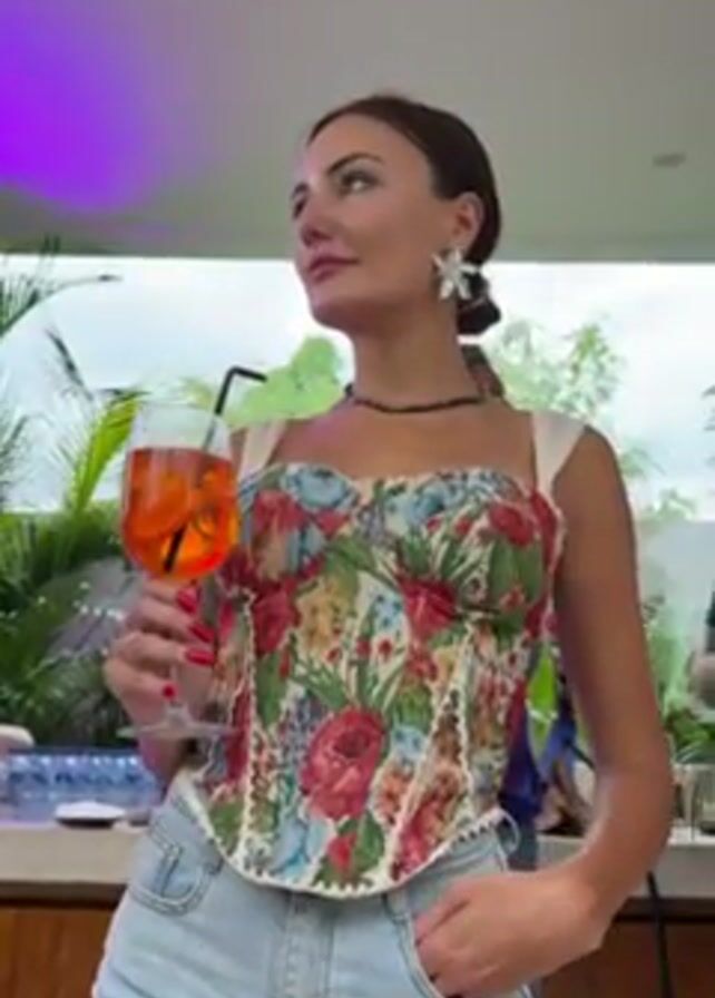 A woman in a floral corset and denim shorts stands behind a bar outside, holding a tall glass of an orange drink with a straw