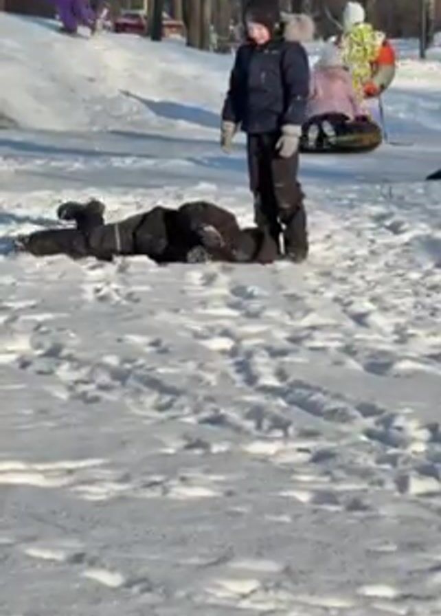 The scene is a snowy outdoor park during the day