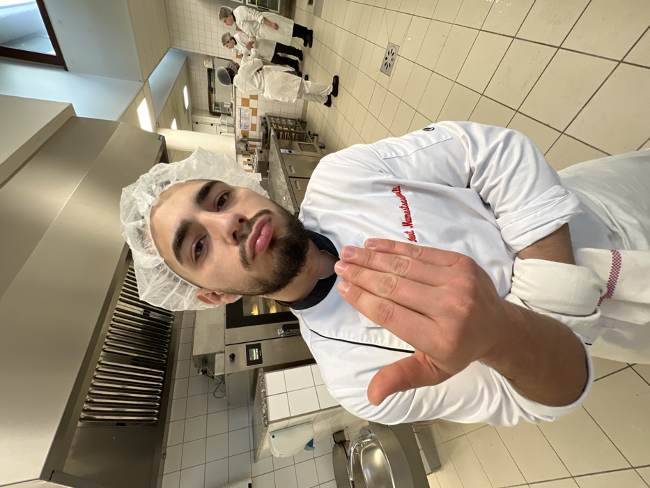 A chef in a white coat, wearing a hairnet, poses for a selfie in a professional kitchen. The chef has a beard and a playful expression. Other people in white coats are visible in the background, along with kitchen equipment like ovens and stainless steel counters. The floor is tiled, and the room is well-lit. The chef's right hand is raised towards the camera, showing the palm. A kitchen towel is tucked into the sleeve of the coat.