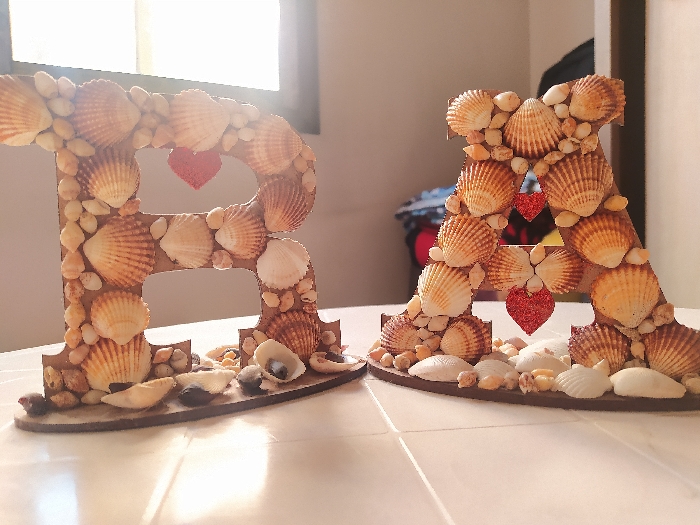 Two decorative freestanding letters, "R" and "A", are displayed on a light, reflective surface. Both letters are constructed from a dark-brown base material and densely covered with various light-colored bivalve seashells and small, light-brown pebbles. The letter "R" incorporates one red glitter heart within its upper loop. The letter "A" features two red glitter hearts: one in its upper triangular opening and a larger one in its lower triangular opening. Loose seashells and pebbles are scattered on the base platforms supporting each letter. The background shows a brightly illuminated window with diffused daylight entering from the left, resulting in an overexposed area. A blurred, dark object is partially visible in the right background. There are no identifiable visual cues within the image to determine its precise geographical location within the city of Harasta, Syria.