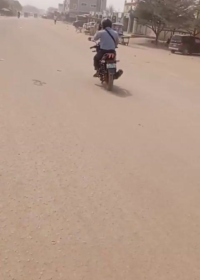 person riding a motorcycle down a dusty, sandy road in what appears to be a town