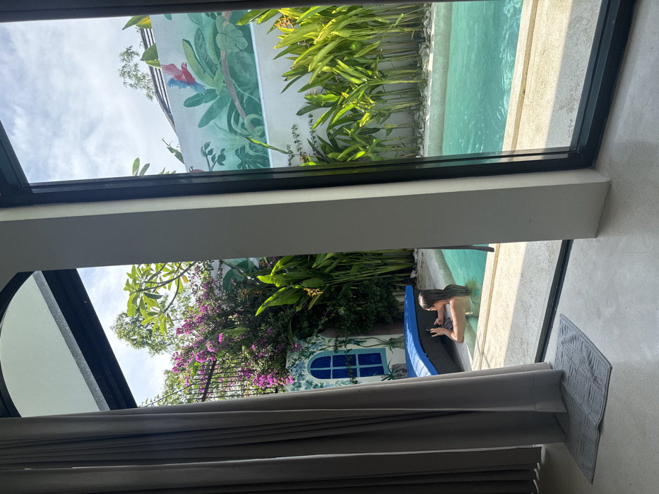 Through a wide window, a scene of leisure is displayed. Lush tropical foliage lines a turquoise pool. A woman sits in the shallow water, focused on a device. A blue lounge chair rests beside her. The window offers a glimpse of a building with a mural and pink flowers. A gray mat is on the floor near the edge of the pool. Light streams in, creating a serene and private setting.