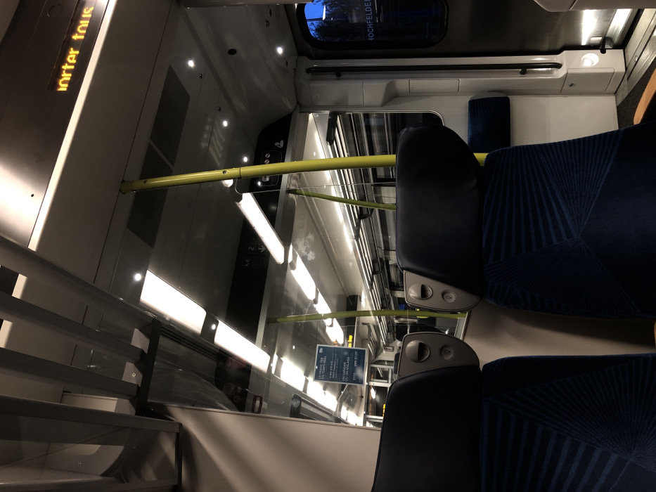 The interior of a train is shown. Seats with blue patterned fabric face forward with a black headrest. A yellow pole runs horizontally between the seats and the window. Overhead lighting illuminates the interior. Outside the window, a sign reads "JOCHFELDEN". The next stop is displayed on a digital display at the front of the train. A information board is on the wall.