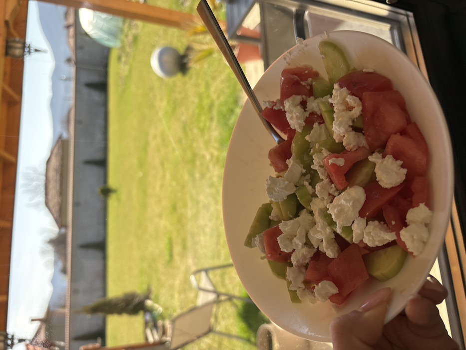 A human left hand, with manicured nails, holds a white, shallow bowl filled with a salad. The salad consists of cubed red watermelon, sliced green cucumber, and crumbled white feta cheese. A silver spoon is partially submerged within the salad. The scene is viewed through a glass surface, exhibiting minor smudges and reflections, and appears to be from a covered outdoor area or sunroom with a wooden frame visible at the top. Beyond the glass, an expansive, bright green lawn occupies the midground. To the left, a light-colored outdoor chair is present. A slender, dark green coniferous tree stands centrally, with a smaller shrub further back and to the right. In the right midground, a large, spherical, reflective garden ornament is visible, accompanied by a translucent dome-shaped structure, possibly a small greenhouse. A tall, light-colored concrete or stone fence defines the rear boundary of the yard. Above the fence, the brown-tiled roofs of residential buildings are discernible. Distant mountains rise against a clear, light blue sky in the background. The scene depicts a sunny daytime environment within a residential area in the city of Dabene, Bulgaria.