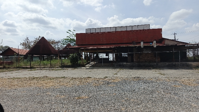 The scene depicts an abandoned or disused building complex in Orupe, Venezuela, under an overcast sky with scattered clouds. The foreground consists of a coarse gravel and cracked asphalt surface, indicating a parking or access area. Stretching across the midground is a low chain-link fence, partially obscured by overgrown weeds and dry grass. Beyond the fence, the primary structure is a large, elongated building featuring a prominent red corrugated metal facade or roof extending across its upper portion. Above this red section, a white, rectangular structure, possibly the frame of a former sign or billboard, is visible. The building's lower level appears open, supported by pillars, revealing a dim interior. A set of concrete steps with metal railings leads up to the main entrance area. To the right of the steps, a section of exposed brick wall is visible. To the left of the main structure, further behind the fence, are several smaller buildings or pavilions. One features a red-tiled or corrugated roof. A distinctive, dark brown, conical-roofed structure, resembling a large gazebo or kiosk, stands prominently to the left of the main building. Behind these structures, trees with sparse foliage and utility poles with overhead lines are visible against the sky. No individuals are present in the scene, and no discernible actions or interactions are occurring. The overall environment appears neglected and weathered.