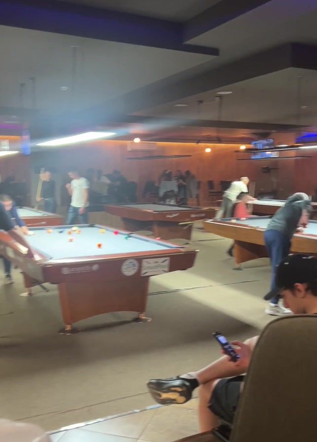 busy pool hall, where multiple people are playing pool on different tables. Some people are standing around the tables, possibly watching the games or waiting their turn. One person is seated in the foreground, looking at their phone. The pool hall has a warm lighting scheme with wooden paneling, and overhead lighting illuminates the pool tables. The space appears to be a social gathering place, with people engaged in recreational activity.