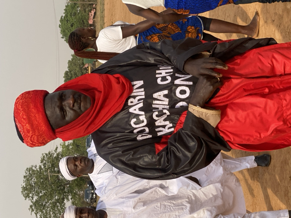An African man wearing a red headdress and black robe with white text stands prominently. The text reads "DOCARIN KACHIA CHIKUN DON". He appears among a group of men, some wearing white traditional clothing and head coverings. A woman with braided hair wearing a white shirt and patterned blue skirt stands in the background. The setting appears to be an outdoor gathering on a sandy terrain.