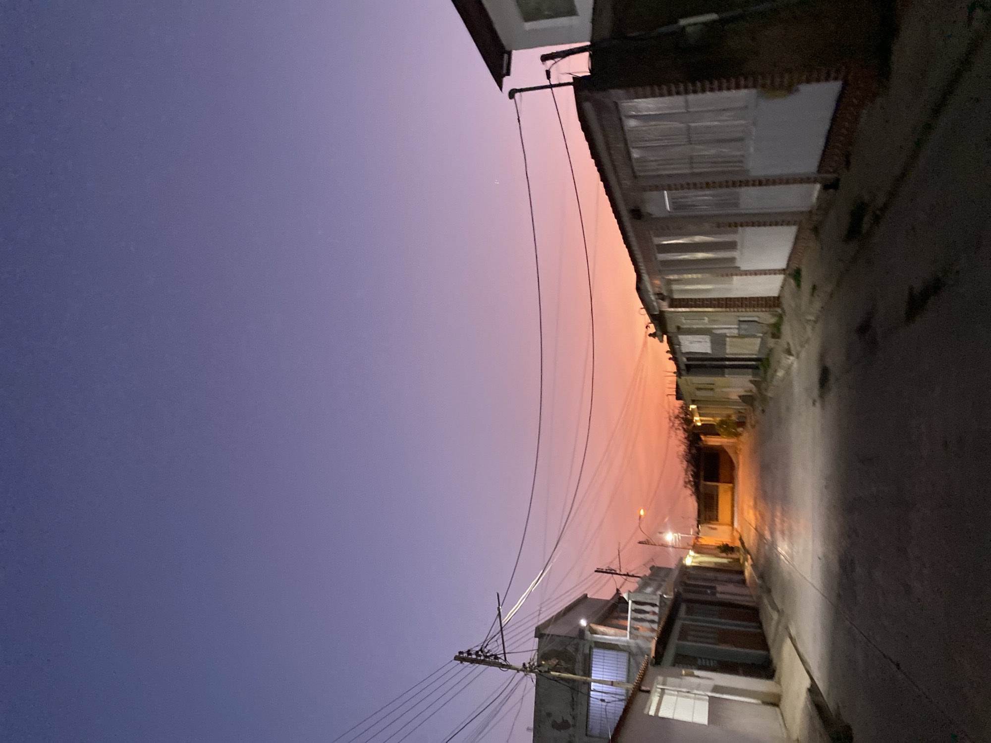 The image depicts a street scene in Cotoperíz, Venezuela at dusk. The sky transitions from a deep purple to orange, with utility lines visible overhead. Buildings line either side of the street. Streetlights illuminate the road, creating a light trail in the distance. There are no people visible.