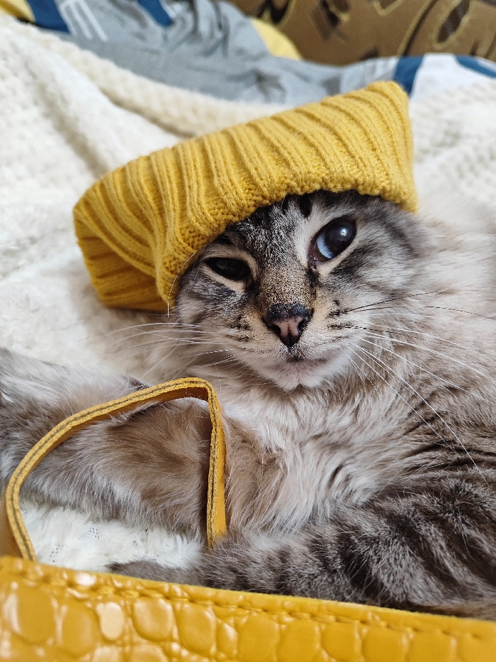 A feline with heterochromia, one blue eye and one brown, wears a mustard yellow knit hat