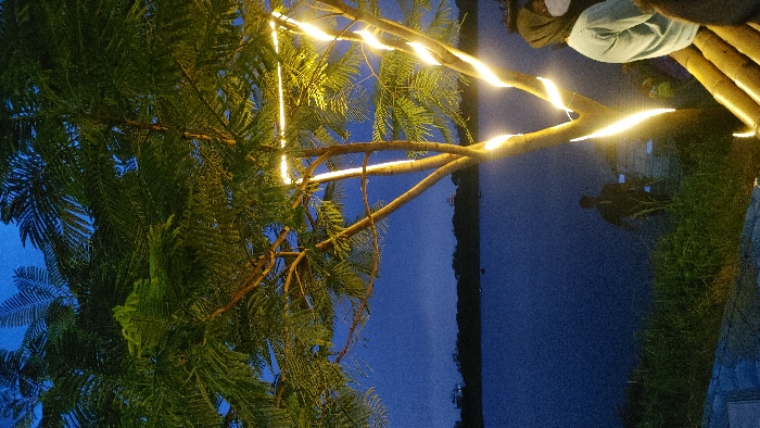 The image depicts an evening scene by a body of water in Purbachal, Bangladesh. In the immediate foreground on the right, a tree with dense green foliage is illuminated by white LED strip lights wrapped around its trunk and primary branches, forming a triangular pattern at the top. Partially visible on the far right is an individual wearing a light blue long-sleeved garment, a white face mask, and a hood, seated or leaning on a structure composed of bamboo poles. To the left, a silhouetted figure in dark clothing stands near the water's edge, facing away from the camera, amidst sparse green vegetation. The central and left portions of the image are dominated by a calm, dark blue body of water, possibly a lake or large pond, with several indistinct dark shapes (potentially small boats or buoys) visible on its surface. The background features a dark, indistinct tree line or distant landmass under a deep twilight blue sky. The scene is lit by the artificial tree lights and ambient low light.