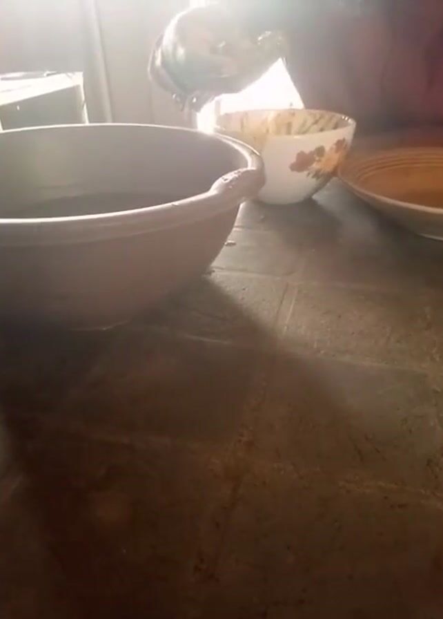 The scene depicts a person standing at a table with several bowls. One bowl is large and brown, another is white with floral patterns, and a third appears to be a wooden plate. The person is apparently preparing food or a recipe, with some of the ingredients visible in the white bowl. The table itself has a dark, possibly tiled, surface, and there is a source of light coming from the top of the frame. The setting appears to be a home, possibly a kitchen.