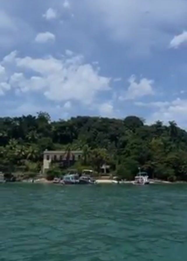 From a boat, a view of a wooded shoreline, a white house with dark window frames, and several small boats. The water is aqua. The sky is blue with scattered clouds.