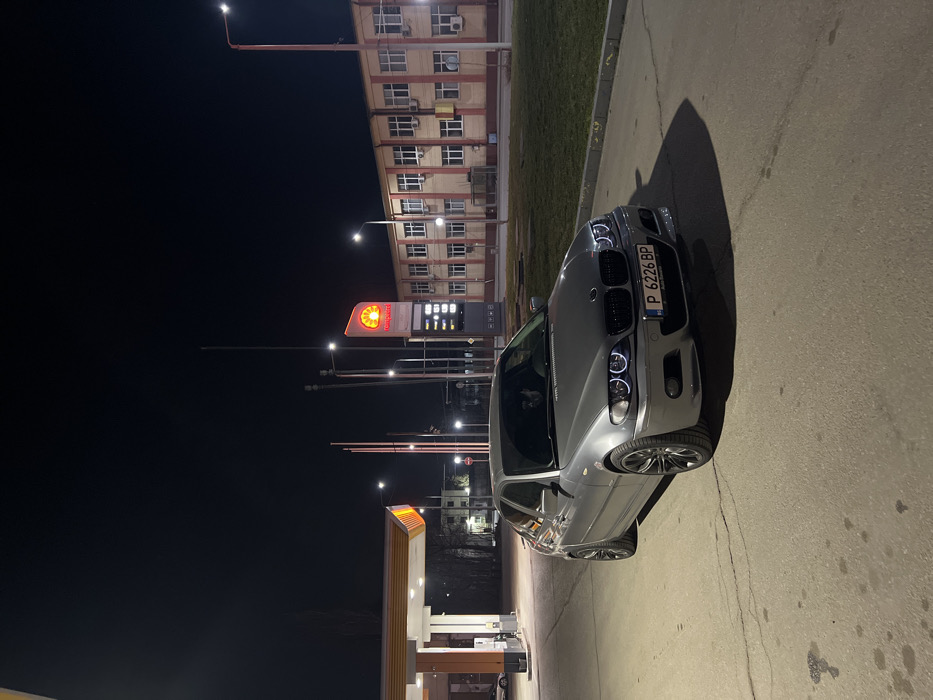 An outdoor nighttime photograph depicts a static scene at a Shell gas station in Ruse, Bulgaria. A grey four-door BMW E46 sedan, equipped with 'angel eye' headlights and a front lip, is parked on a paved surface in the foreground. Its Bulgarian license plate, 'P 6226 BP', is affixed to the front bumper. A solitary individual is partially visible in the driver's seat of the BMW. To the left, a section of an orange and yellow Shell gas station canopy is discernible, beneath which a distant white vehicle is partially visible. Centered in the background is an illuminated Shell sign displaying current fuel prices. Behind a narrow strip of green grass, a multi-story building with multiple windows and external air conditioning units forms the backdrop. The area is artificially illuminated by streetlights, the gas station's illuminated signage, and the vehicle's active headlights against a dark night sky.