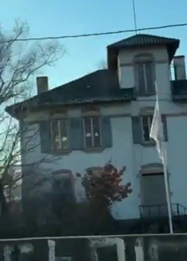 The camera is positioned inside a vehicle, likely a car, traveling along a road or highway. The view through the side window features a series of buildings and trees passing by in a blur. The buildings vary in style, from a two-story house with boarded-up windows to structures with graffiti on their walls. The trees are mostly bare, suggesting a season like winter or early spring. Overhead power lines cut across the bright, clear blue sky. The motion of the vehicle creates a sense of continuous movement.