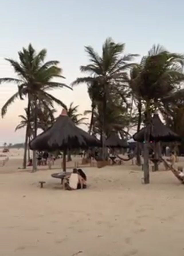 beach scene at dusk. The sand is light and there are several palm trees scattered around. Some of the trees are arranged in groups, with thatched-roof umbrellas and picnic tables beneath them, where people are sitting and relaxing. A hammock is strung between two trees and someone is relaxing there. In the background, there are waves breaking on the shore. A small child walks towards the ocean and a lifeguard vehicle is parked on the sand. The sky is a mix of light blue, pink, and light orange, suggesting a sunset or sunrise.