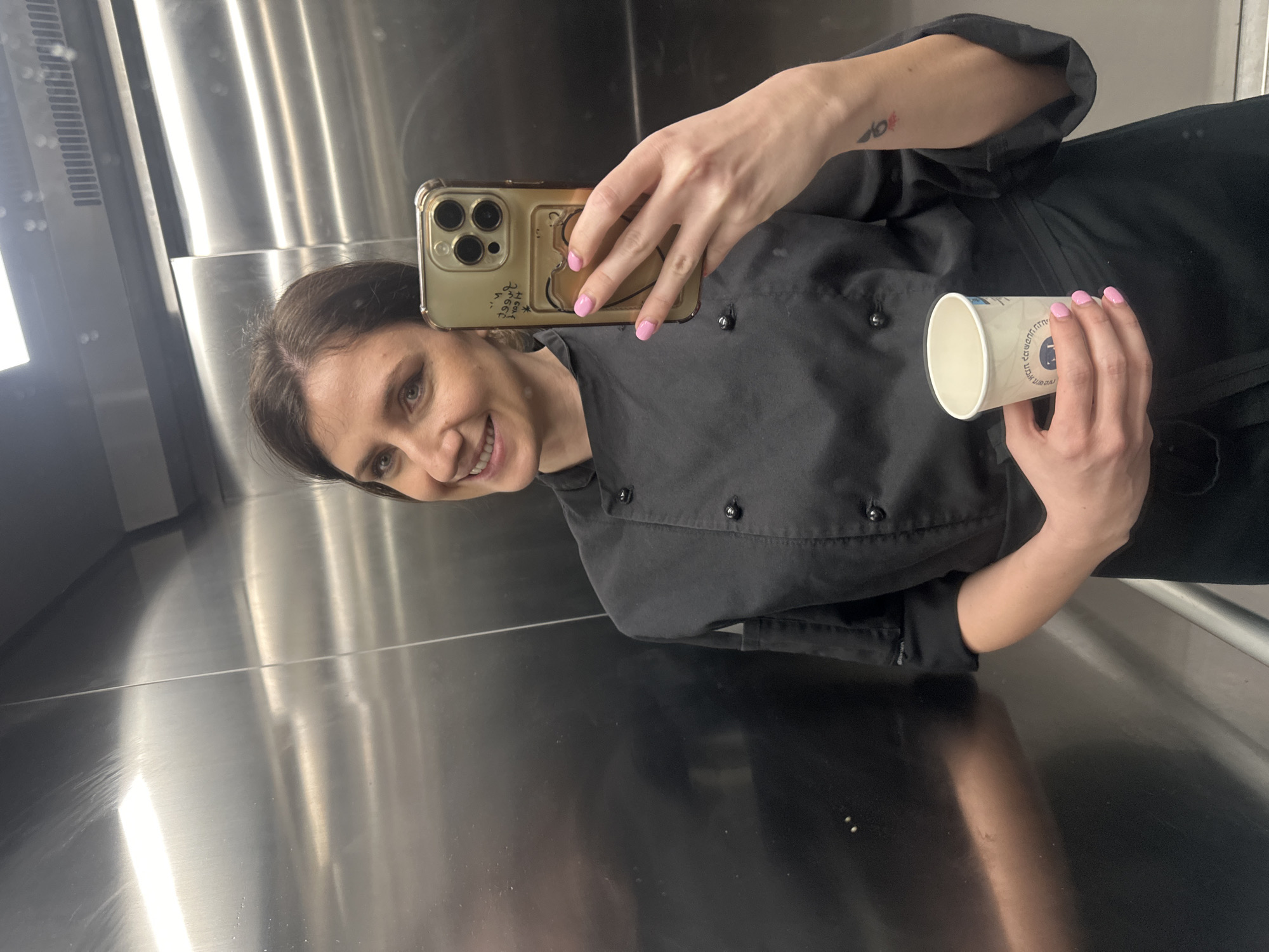 A woman in a black chef's coat takes a selfie. She is smiling and holding a paper cup in one hand and a cell phone in the other. The background consists of reflective stainless steel surfaces, suggesting an industrial or kitchen setting. The cup has blue and white markings in Hebrew. The woman has pink nail polish and a tattoo on her arm. The location cannot be determined to be Varna, Bulgaria from the image alone.