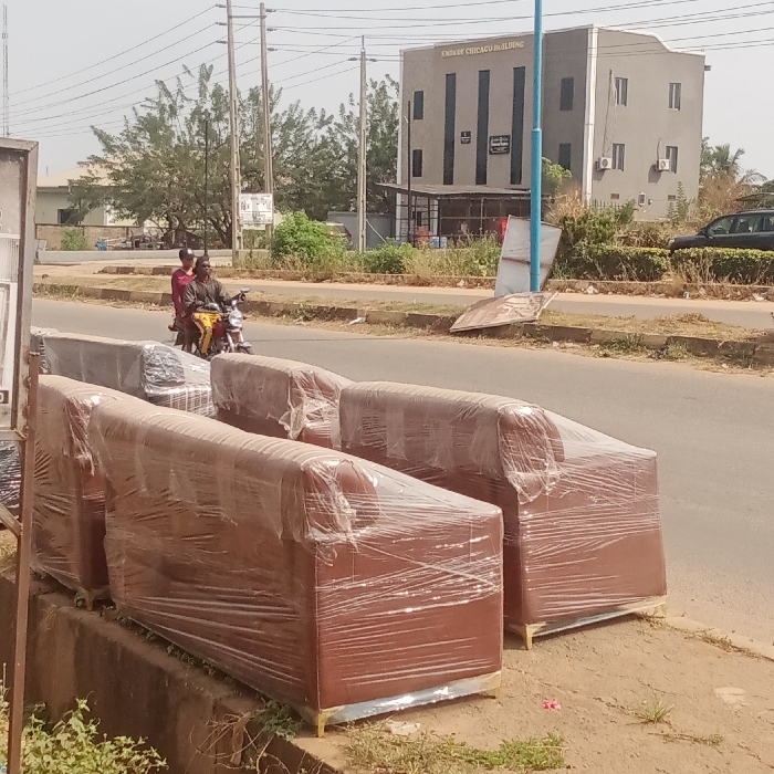 The image depicts a street scene in Oshogbo, Nigeria, with new furniture displayed in the foreground and a prominent building in the background