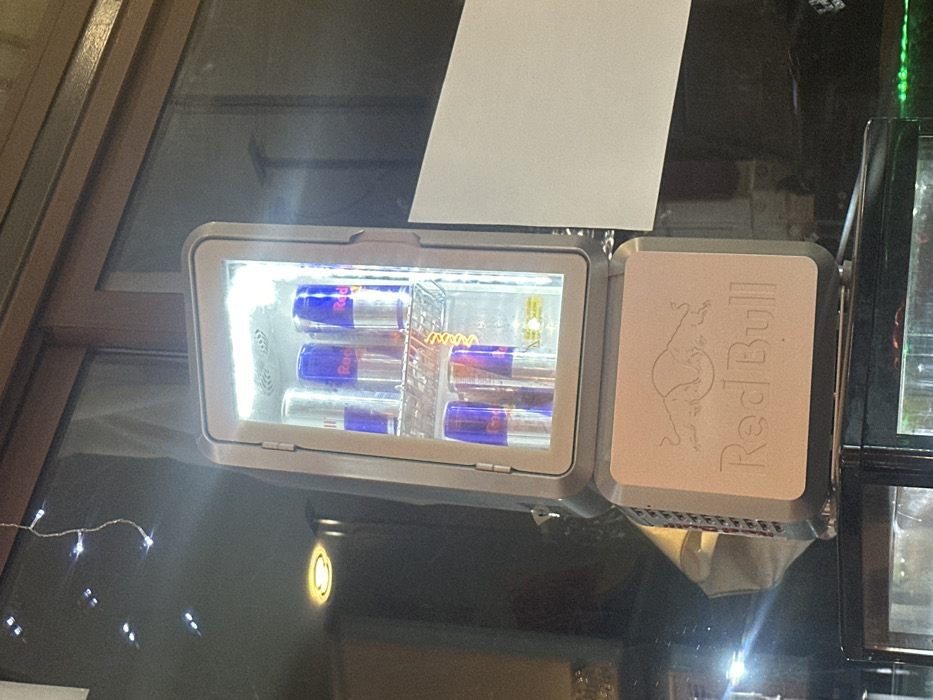 This image displays an illuminated Red Bull branded mini-fridge situated within a commercial interior in Haskovo, Bulgaria