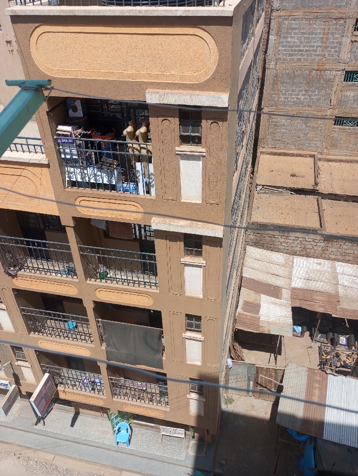The image depicts an exterior scene in Witeithie ward, Kenya, featuring a prominent five-story building on the left, an unfinished concrete block structure adjacent to it, and a collection of informal shanty-like structures on the right. The main building has a light brown stucco facade with decorative rectangular panels and dark metal railings on each balcony from the second to the fourth visible floor. The uppermost visible balcony (fourth floor) is cluttered with various items, including two beige torso mannequins facing outwards, boxes, and an orange bucket. The third-floor balcony displays a blue basin and what appears to be drying laundry. The second-floor balcony is partially covered by a dark mesh screen. On the ground level, a grey paved walkway features a blue plastic chair, a white bench, and two commercial signs, one white with red lettering. An unpaved road borders the paved area in the foreground. Adjacent to the main building on the right, an unfinished or dilapidated multi-story structure is constructed from grey concrete blocks, with several small windows, some equipped with green metal grilles. Below this, a dense cluster of single-story structures with rusted, corrugated metal roofs forms an informal settlement or market area. This area contains blue tarpaulins, barrels, and other miscellaneous items. Two individuals are visible towards the lower right within this area, near a wooden stall, one of whom is seated. Multiple black utility wires crisscross the upper and middle portions of the image horizontally. A green pipe extends diagonally from the upper left. The scene is brightly illuminated by direct sunlight, casting distinct shadows and indicating daytime conditions.