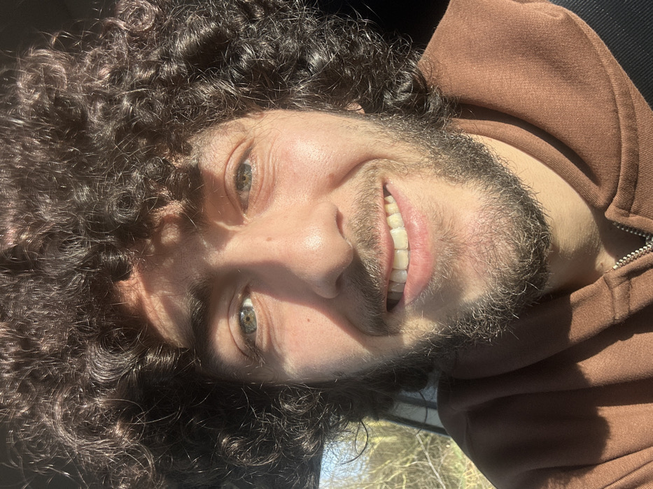 A single male individual is depicted in a close-up portrait, located in Lambres-lez-Douai, France. The subject has dark, voluminous curly hair, light-colored eyes, and a full beard and mustache. He is smiling broadly, exposing both upper and lower teeth. He wears a brown zippered hooded sweatshirt, with a metallic zipper pull visible at the collar. A dark strap, consistent with a vehicle seatbelt, diagonally crosses his right shoulder and upper chest. Strong sunlight illuminates the left side of his face, casting distinct shadows from his hair onto his forehead and from his nose. The background on the left, visible through a window, consists of out-of-focus bare trees or bushes against a bright sky, suggesting an outdoor, possibly roadside environment. The background on the right is dark and indistinct, consistent with a vehicle's interior.