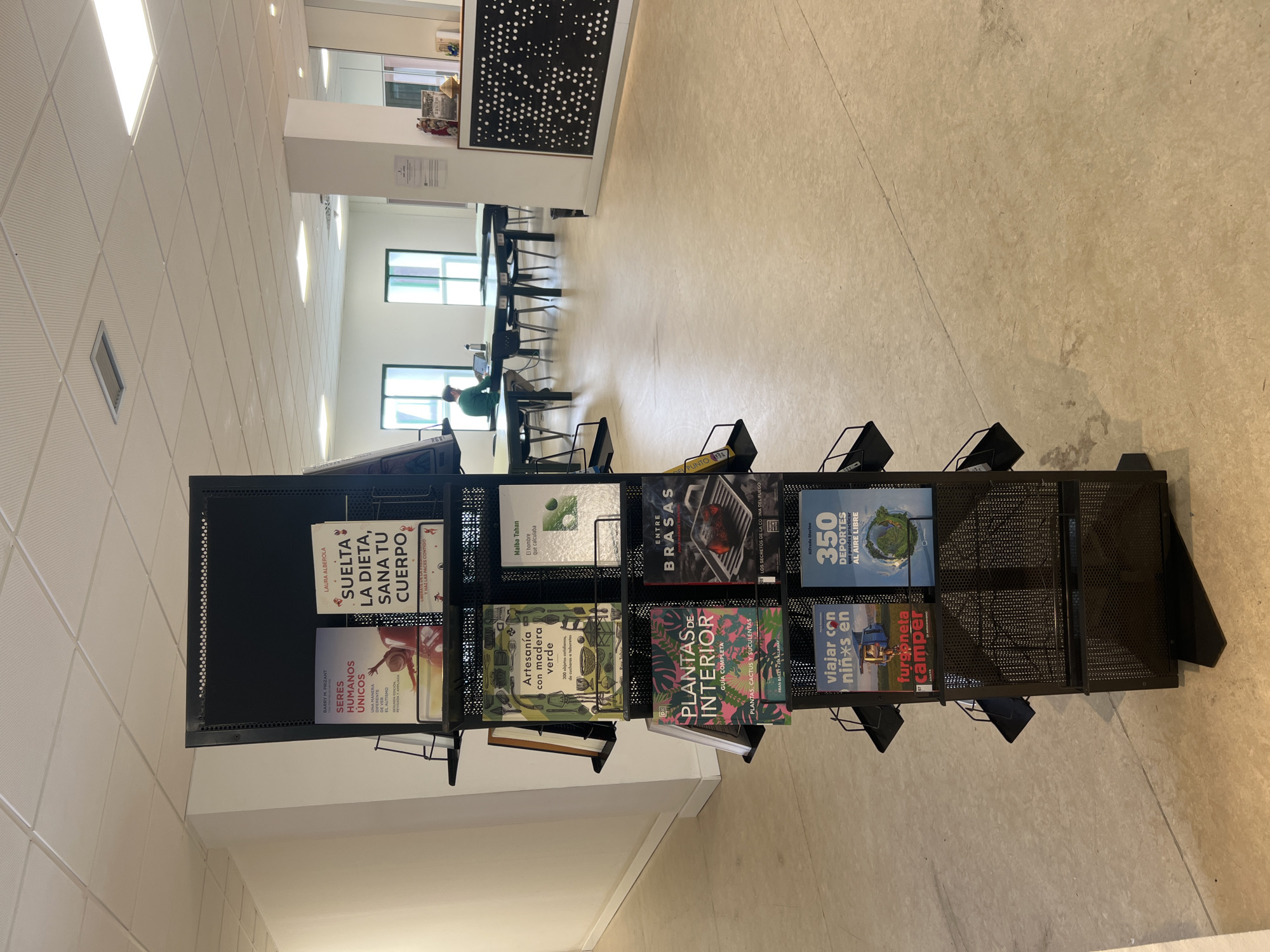 The image depicts an indoor scene within a modern public facility, likely a library or study area, located in Santa Lucía de Tirajana, Spain. In the foreground, positioned centrally, is a black, multi-tiered rotating metal book display stand. The stand holds various books with their covers facing outwards. Visible titles include "SERES HUMANOS ÚNICOS" (Unique Humans), "SUELTA LA DIETA, SANA TU CUERPO" (Let Go of the Diet, Heal Your Body), "Artesanía con madera verde" (Crafts with Green Wood), "PLANTAS DE INTERIOR" (Indoor Plants), "ENTRE BRASAS" (Among Embers), "viajar con niñxs en furgoneta camper" (Traveling with Children in a Camper Van), and "350 DEPORTES QUE PUEDAS PRACTICAR AL AIRE LIBRE" (350 Outdoor Sports). In the midground, to the left of the book stand, a male individual is seated at one of several rectangular tables. He wears a green long-sleeved shirt and beige pants and is actively using a silver laptop. A dark water bottle or thermos sits beside the laptop. The tables feature dark tabletops and black legs, accompanied by black chairs. The environment is characterized by white walls and a light-colored, possibly beige or pale grey, tiled floor. The ceiling is a white suspended grid with numerous recessed square LED light fixtures. In the background, large rectangular windows with dark frames admit natural light. To the right, a dark counter or partition with a decorative perforated panel, displaying a starburst pattern, separates the main area. A small black waste bin is positioned near this counter, which also holds various small decorative items. The overall scene suggests a clean, well-lit, and functional public space.