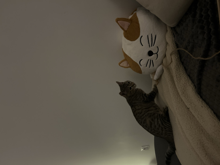 - "A tabby cat is climbing an off-white, textured cat tree towards a stuffed cat toy" by FM-ig9Bt2, licensed under CC BY 4.0