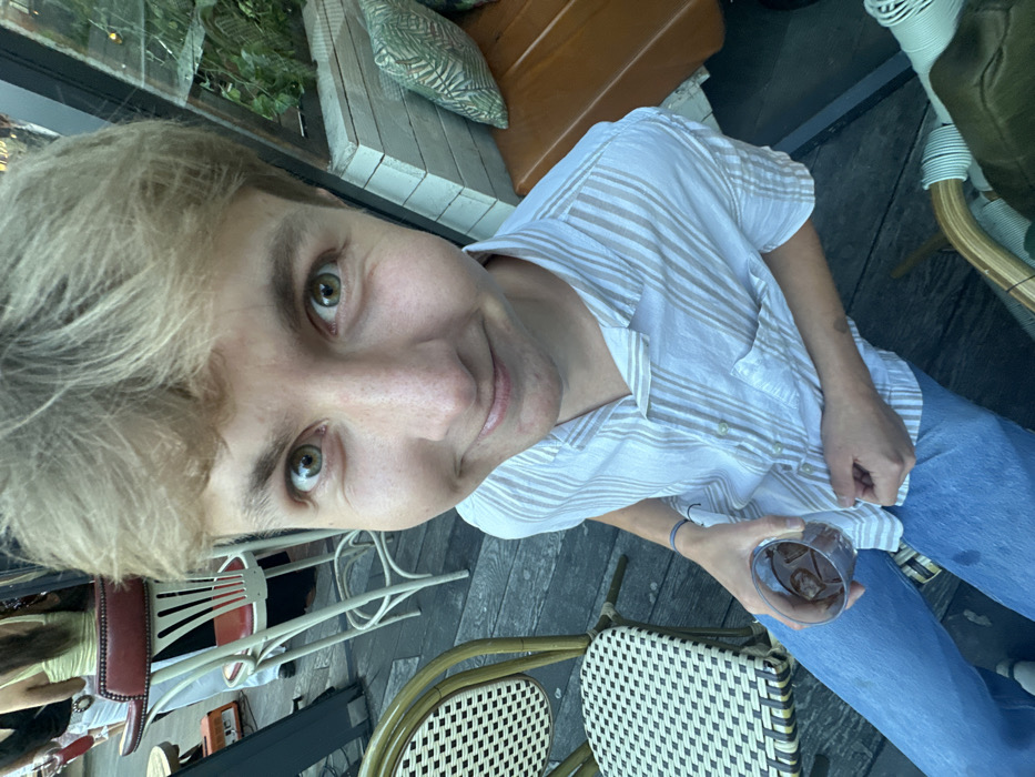 The image depicts a young man wearing a white and tan striped shirt and blue jeans. He is holding a glass of liquid with ice in it and looking up at the camera with a smile. He is seated on a wooden deck with a white rattan chair to his left. The image was taken on the Quayside in Newcastle upon Tyne, United Kingdom, a bustling area with restaurants and bars overlooking the River Tyne. The photo was taken from a low angle, looking upwards at the man. The background is slightly blurred, and the focus is on the man's face and the glass in his hand. The environment is a relaxed and social setting, likely a bar or outdoor dining area. The man appears to be enjoying his time and is interacting with the camera, possibly for a photograph.
