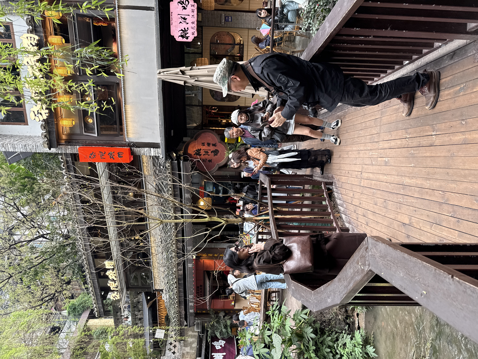 The image displays an outdoor pedestrian area within Nan'an District, China, characterized by traditional Chinese architecture and a narrow waterway. In the midground, a wooden walkway with dark brown railings traverses the scene, spanning over a shallow, murky stream visible on the left. Numerous individuals occupy the walkway and surrounding areas. On the right side of the walkway, a man wearing a camouflage baseball cap, a dark jacket with an emblem on the left sleeve, dark pants, and brown lace-up boots, holds a small electronic device, likely a smartphone or compact camera, in both hands, aimed towards the left. A larger camera with a strap hangs at his side. To his immediate left and slightly behind him, a young woman in a light-colored beret and dark leather-like jacket is observing her smartphone. Behind her, an older man in glasses and a dark jacket walks past. Further back, another woman in a light brown jacket holds a white umbrella. Opposite the man with the camera, on the left side of the walkway, a woman in dark sunglasses and a brown long-sleeved jacket or coat smiles, looking in the direction of the man with the camera. She carries a large brown leather shoulder bag. The background features multi-story buildings constructed with traditional Chinese architectural elements, including dark tiled roofs and overhanging eaves. Several establishments are identifiable by their illuminated signs with Chinese characters. Prominently visible signs include "桃渊鸣 桃花鱼江湖菜" (Peach Blossom Fish River and Lake Cuisine), a red vertical banner reading "茶院烧肉" (Tea House Roasted Meat), and an upper-level sign reading "法院茶园" (Court Tea Garden). Yellow lanterns hang from the eaves of one building. Throughout the scene, additional individuals are present, seated at outdoor tables equipped with wooden chairs and some folded beige patio umbrellas, or walking along pathways. Many are observed interacting with their mobile phones. Lush green vegetation, including trees with light green spring foliage and bare branches, as well as ground cover, is abundant, particularly along the stream bank and integrated within the architectural spaces.