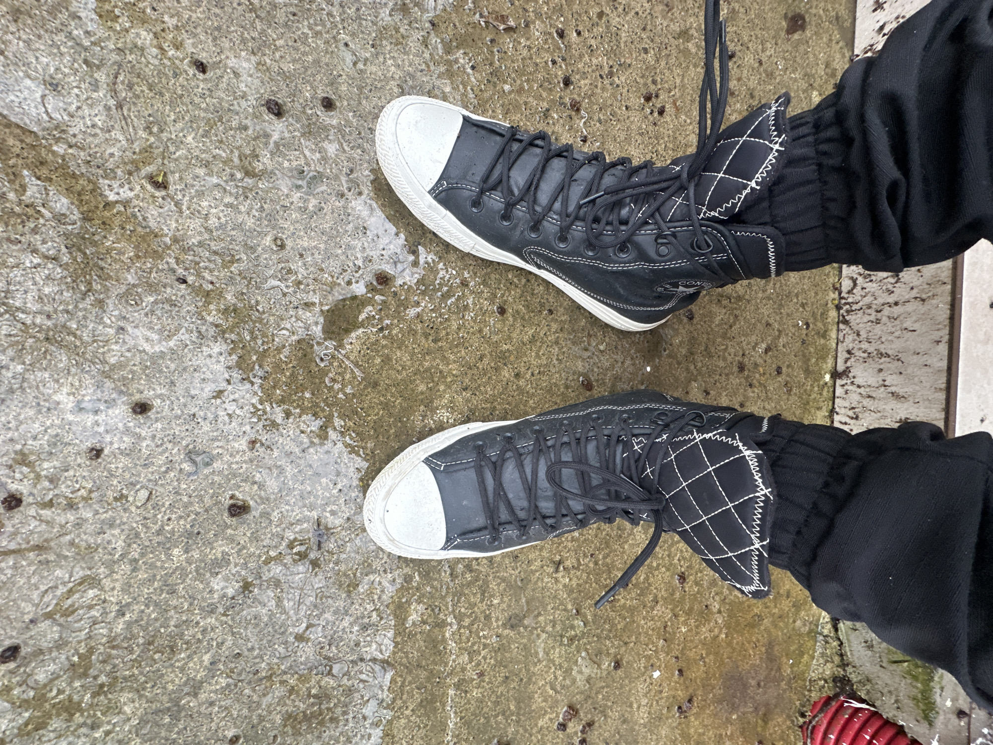 view of two black Converse high-top sneakers with white toe caps, laces, and detailing. The shoes are being worn by a person, whose legs are clad in black cuffed pants. The ground appears to be concrete or a similar material, wet or damp in some areas. The overall setting appears to be an outdoor area in Kiten, Bulgaria.