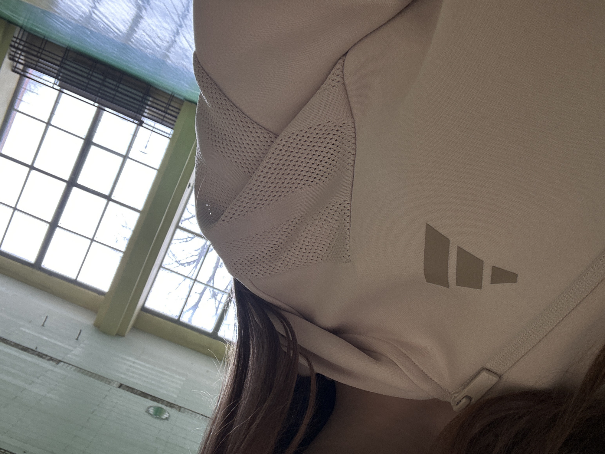 The image captures a partial, over-the-shoulder view of an individual positioned inside a gymnasium in Tutrakan, Bulgaria. The subject wears a light beige or off-white hooded sweatshirt (hoodie) featuring a dark grey Adidas "three bars" logo on the upper left shoulder. The hoodie's shoulder area is constructed with a distinct perforated mesh fabric panel, and a subtle zipper detail is visible near the collar. Long brown hair cascades over the subject's right shoulder. The indoor environment is characterized by a high, light-colored ceiling with visible structural elements and a recessed light fixture. Large, multi-paned windows dominate the background, allowing bright natural light into the space. The window frames are dark, and the adjacent structural columns are painted a pale green. Outside the windows, bare tree branches indicate a deciduous outdoor environment, possibly in winter or early spring. The floor of the gymnasium is a glossy, reflective green surface, potentially covered by a transparent protective layer, which exhibits reflections of the windows and overhead lighting. A dark-colored, multi-barred protective barrier or railing is situated along the wall beneath the windows. No specific actions or interactions are discernible beyond the subject's presence in the facility.