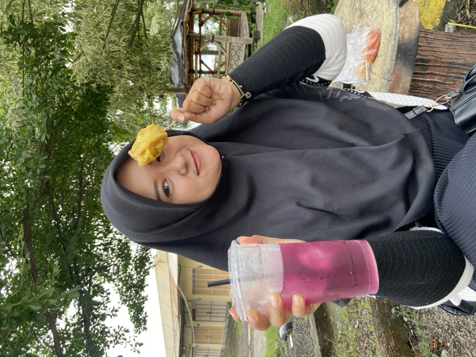 A medium close-up photograph depicts a female individual, appearing to be of Southeast Asian ethnicity, situated outdoors in Kalitengah, Indonesia