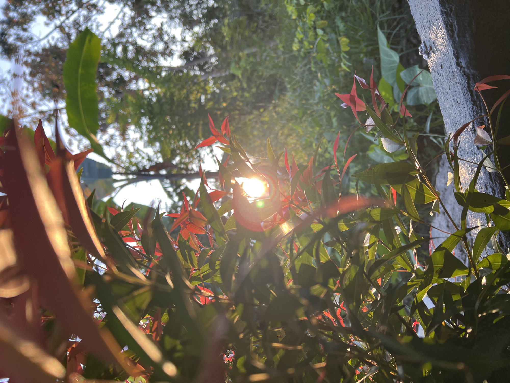The image captures a lush, close-up scene of foliage in Unknown, Indonesia. The foreground is filled with shrubs displaying red and green leaves, with the sun shining through them, creating a bright flare. Behind the shrubs, other greenery, including a large banana leaf, is visible. The background shows more trees and the sky. To the right of the shrubbery, a concrete structure is partly visible. The overall impression is one of tropical vegetation illuminated by sunlight.