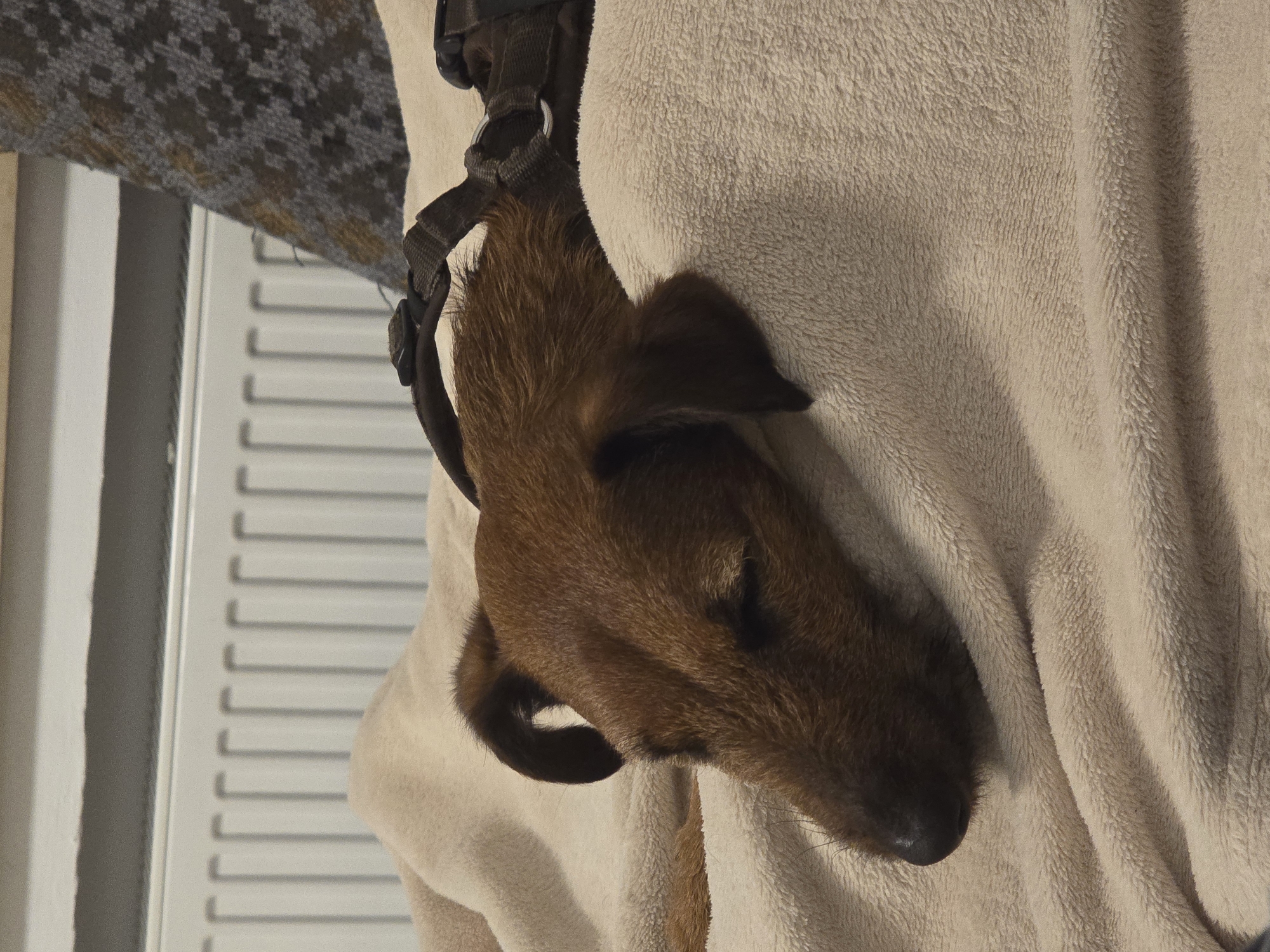 A brown-furred dog, consistent with a terrier breed, is observed resting or sleeping indoors in Iserlohn, Germany. The animal lies on a light beige, soft-textured blanket, with its head turned to the left and eyes closed. A dark-colored harness is visible on the dog's back and shoulders. In the background, a white panel radiator with vertical fins is positioned horizontally. To the upper right, a patterned fabric with a gray and brown/gold speckled design is partially visible.