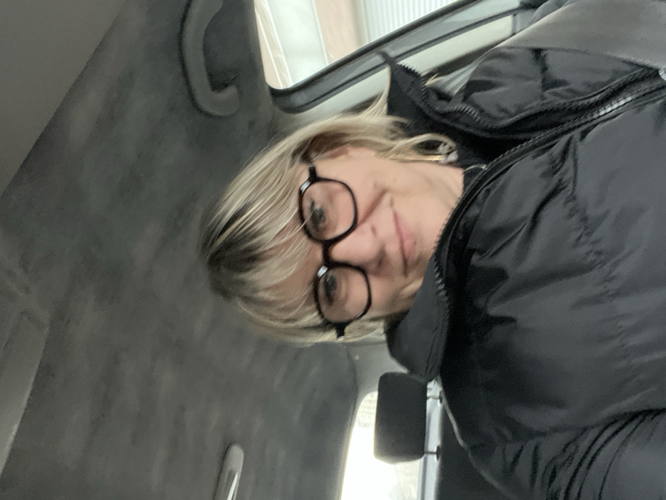 The scene depicts a blonde individual with bangs and dark-rimmed glasses, wearing a black puffy jacket, situated inside a vehicle. The person is looking directly forward and exhibits a slight smile. The vehicle's interior features a grey fabric headliner, an overhead light fixture, and a grey passenger-side grab handle. A black rear seat headrest is visible behind the individual. Exterior elements, blurred through the windows, suggest a building with horizontal siding on the right and indistinct outdoor features on the left. This event takes place in La Fouillouse, France.
