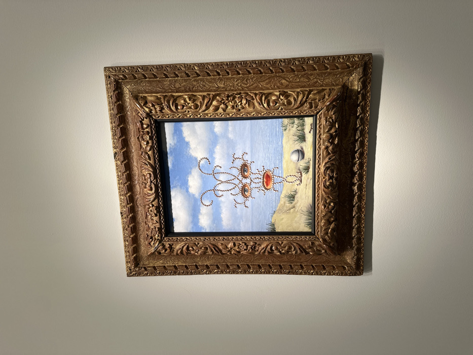 A framed painting, "La reconnaissance infinie" (The Infinite Recognition) by René Magritte, is centrally displayed at a slight angle on a plain, light grey wall
