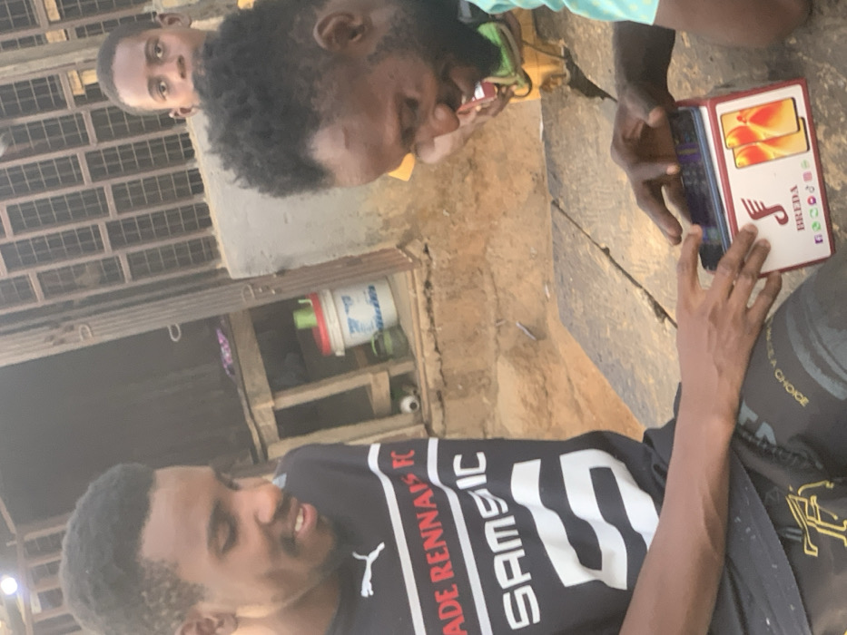 Three men are sitting at a table. One man is seated, wearing a black soccer jersey that reads "MADE RENNAIS FC" and "SAMSIC." A second man next to him is looking at a smartphone box that reads "BREDA" and shows two phone images. Another man stands in the background, his gaze directed at the camera. The setting appears to be outdoors, with simple construction in the background.