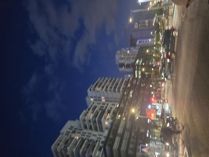 A nighttime cityscape features towering white buildings against a dark blue sky with wispy clouds. Streetlights illuminate a busy road filled with cars, creating blurred streaks of light. Various commercial signs and advertisements are visible, adding to the urban atmosphere. The image is taken from a slightly angled perspective, showcasing the depth and complexity of the city scene.