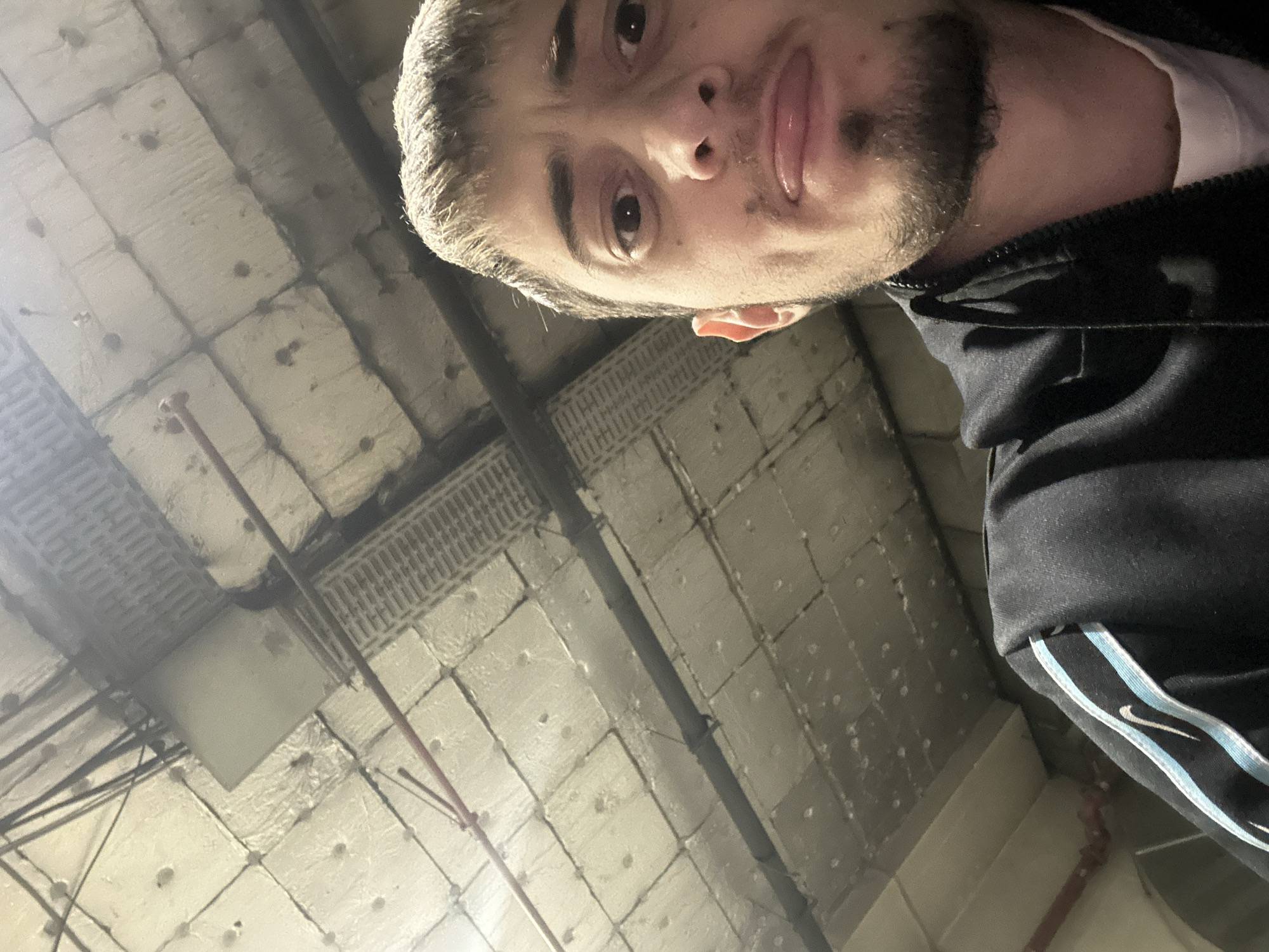 A low-angle selfie of a bearded man wearing a black tracksuit with light blue stripes. The background shows a concrete ceiling with visible installations such as pipes, wiring, and ventilation. The photo appears to have been taken in an underground or industrial-like space, but without further context or identifiable landmarks, it is impossible to confirm if the location is in Varna, Bulgaria.