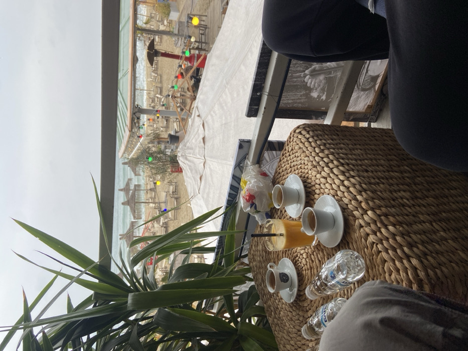 The image depicts an outdoor elevated seating area overlooking a beach and the Black Sea in Varna, Bulgaria, under an overcast sky. In the immediate foreground, a woven natural fiber square table holds three white espresso cups with saucers, a glass of orange juice with a black straw, and two plastic bottles of Balkan mineral water. Partially visible are the legs and arms of two individuals seated at the table; one wears light-colored clothing on the left, and the other wears dark trousers on the right. A large green-leafed plant occupies the left foreground, partially framing the scene. Beyond the table, a sturdy railing separates the viewer's position from the beach below. A large white patio umbrella is visible directly below the railing, suggesting another seating level. Further out, a beach bar or restaurant structure with a light green roof is illuminated by colorful string lights, featuring red, green, blue, and yellow bulbs. A red outdoor heater stands near this structure. The sandy beach is populated with numerous rows of straw umbrellas and empty lounge chairs, extending towards the gentle waves of the sea. The horizon line is visible under a uniformly gray, cloudy sky.