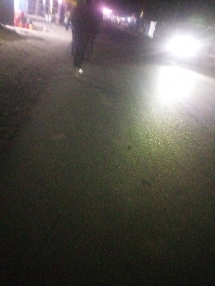 A dark road scene at night. A person walks along the road, partially illuminated. Bright headlights from an unseen vehicle shine on the road ahead. Buildings and other individuals are dimly visible in the background. The overall impression is of low-light conditions and limited visibility.