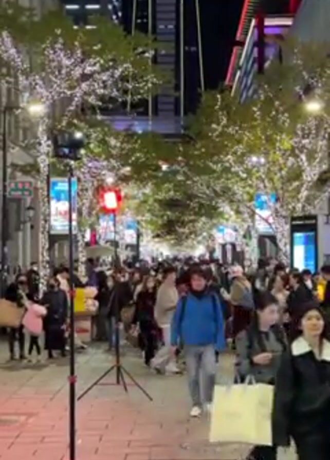 The video depicts a bustling street scene at night. Many people are walking in the same direction down the pedestrian walkway. The street is lined with trees decorated with numerous white lights, creating a festive atmosphere. Tall buildings are visible on both sides of the street. A tall lighting rig stands on a tripod on the left side of the street. The sidewalk is paved with brick. People are wearing winter clothing such as jackets and coats. Some are carrying bags.