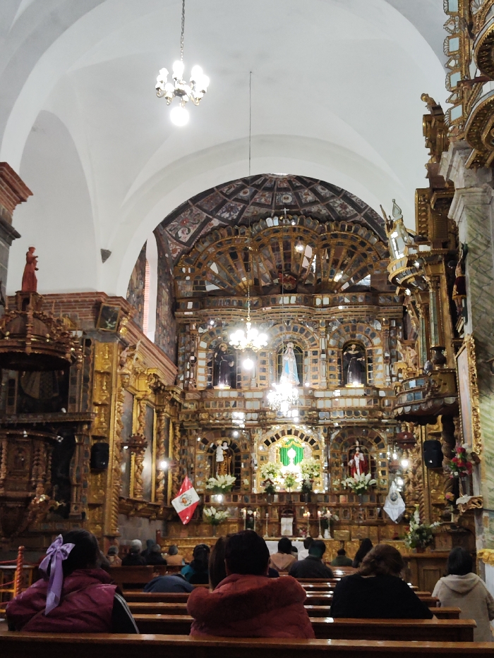The interior of a church is captured from behind seated parishioners. The altar is ornate, adorned with gold and mirrors, statues of saints, and lit by chandeliers. Peruvian flags flank the central display. White arches define the architecture, transitioning into a dome patterned with dark, geometric designs. Natural light filters through the high windows, complementing the artificial lighting illuminating the religious space.