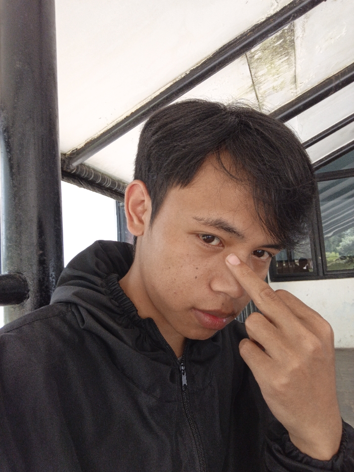A young male individual, appearing to be of East Asian or Southeast Asian descent, is depicted in a medium shot, looking directly forward. He has short, dark hair, dark eyes, and a medium complexion with visible minor skin irregularities on his right cheek. He is wearing a black hooded jacket with a visible zipper closure down the front. His right hand is raised, with the index finger extended and touching the bridge of his nose, specifically near the inner corner of his left eye. The background features a white corrugated ceiling or roof structure, supported by horizontal black beams, and a prominent dark cylindrical pillar on the left side of the frame. To the right, a window with black frames provides a view of distant green foliage and a light-colored wall. The scene is illuminated by natural light. The location is Cimacan, Indonesia.