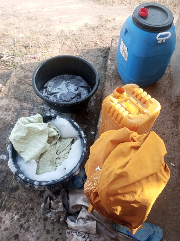 The image captures an outdoor laundry setup in Ebiya, Nigeria, under natural daylight