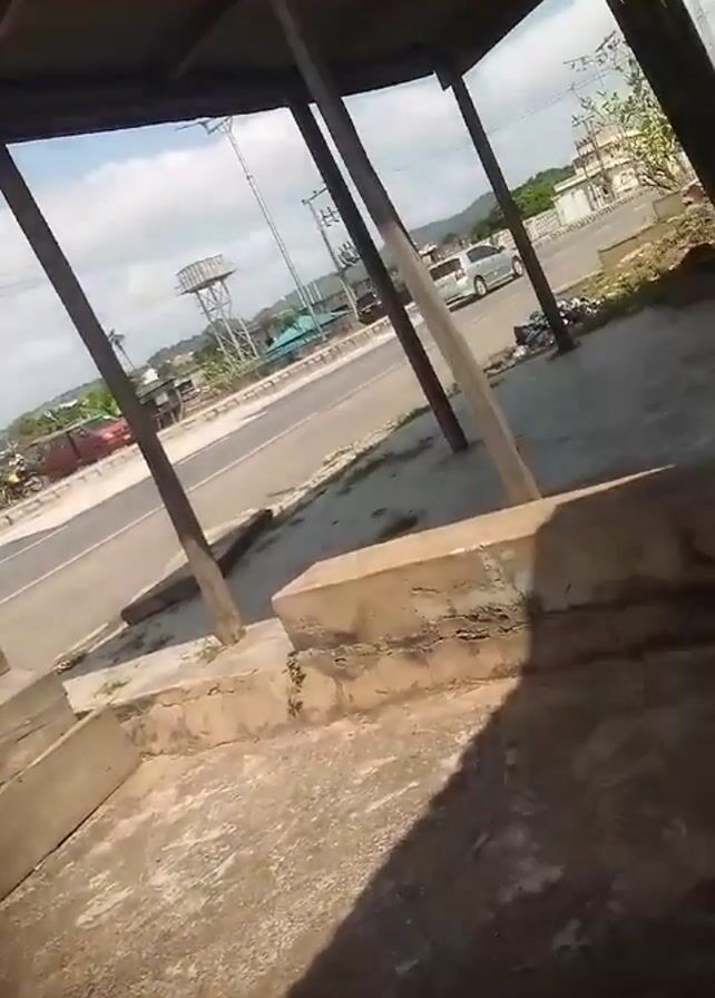 view from under a wooden shelter, looking out onto a paved area and a road. The shelter has wooden support posts and a roof that casts shadows on the ground. Outside the shelter, there are stacked concrete blocks near the road. The road has light traffic, including cars and a motorcycle. In the background, there are buildings, trees, a water tower, and power lines under a partly cloudy sky. The overall lighting is bright.