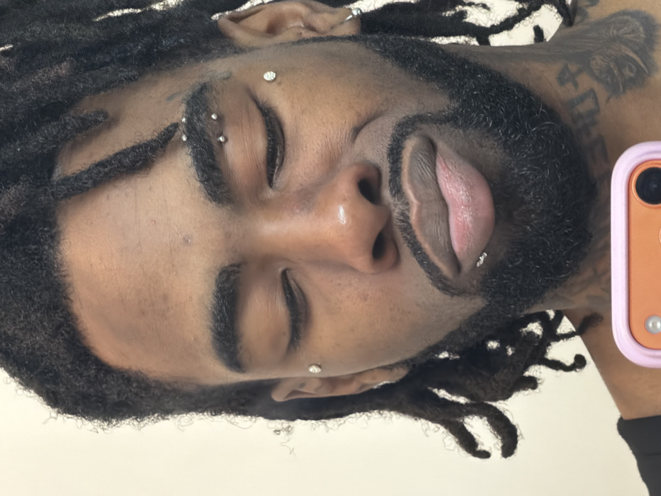 A close-up, head-and-shoulders portrait depicts a male individual with dark skin tone, dreadlocks, and a full beard